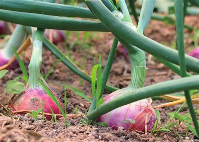 春季洋葱返青以后要进行第一次施肥,为根系补充营养,同时也为地上部分的旺盛生长打基础。施肥要以充分腐熟的有机肥为主,每亩施入1000公斤,加入20公斤过磷酸钙和10公斤硫酸钾。地膜覆盖地一般只结合浇水,每亩施入硫酸二铵15公斤和硫酸钾10公斤。