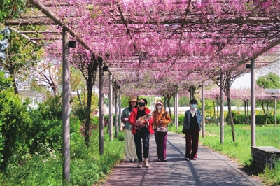 这里有一条全长3.3公里的紫藤长廊。华亭镇城市建设管理事务中心副主任袁媛介绍,这条长廊建成于2019年,沿途种植了300多株日本长穗多花紫藤,花色涵盖紫、白、粉等多种颜色。同时这也是紫藤养护技术下乡的生动样本。在“紫藤工匠”们的指导下,今年3月,北新村的紫藤长廊完成了新一轮的修剪,待到盛花效果时,将形成一道道绚丽的紫藤瀑布。
