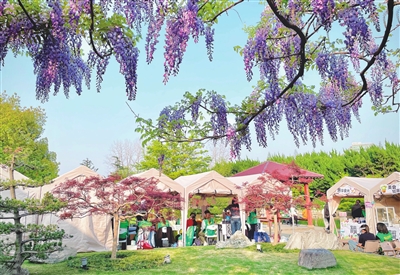 今年,嘉定紫藤季以“紫韵疁城 全嘉欢藤”为主题,推出了云互动赏花、文创集市、主题歌曲发布等活动。紫藤园内,市民可参与紫藤手工漆扇制作、拓印等非遗体验,品尝嘉定特色小吃,全方位感受紫藤之美。