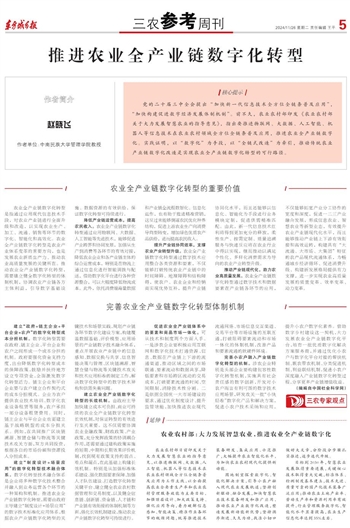 农业全产业链数字化转型是指通过应用现代信息技术手段,对农业产业链进行全面升级和改造,以实现农业生产、加工、流通、销售等环节的数字化、智能化和高效化。农业全产业链数字化转型是农业产业体系变革的重要方向,也是发展农业新质生产力、推动农业高质量发展的关键所在。推动农业全产业链数字化转型,需要建立健全数字化转型的体制机制,协调农业产业链各方主体利益,引导数字基础设施、数据资源的有效供给,保证数字化转型可持续进行。