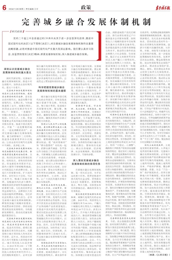 党的二十届三中全会通过的《中共中央关于进一步全面深化改革、推进中国式现代化的决定》(以下简称《决定》),对完善城乡融合发展体制机制作出重要战略部署,必将对推进中国式现代化产生重大而深远影响。我们要认真学习领会、全面贯彻落实《决定》精神,抓紧完善体制机制,深入推进城乡融合发展。