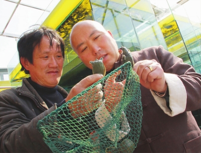 为打造优质生态种鳖基地,浦东南汇农民王清从浙江引进了大量日本种鳖,并掏尽了自己多年经商积攒的钱,通过规模化生态养殖提升核心竞争力,以此带动更多农民共谋发展之路。图为王清(右)正在给合作社的农户讲解“日本鳖”的特征及相关饲养经验。
