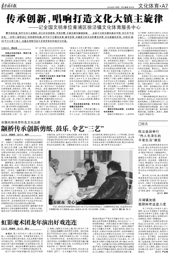 本报讯 去年被评为“中国民间文化艺术之乡”,享誉沪上“海派剪纸”非遗传承基地的颛桥镇,今年文体工作启动早、力度大、活动多,举措实,他们立足“普惠、公益、便捷”原则,突出“文化民生”宗旨意识,努力创新运行机制,满足社区群众更加多样化的文体活动需求。2月份全面启动剪纸、鼓乐、伞艺“三艺”活动项目,用活动促发展,用普及推创新,力求创造上海郊区公共文化服务和“非遗”传承工作领先卓越的新业绩。