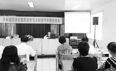 日前,金山区检察院副检察长应邀来到亭林镇作职务犯罪风险防范专题报告,共80余人参加了报告会,这是该院今年推出“检察长论案说法”活动的第5站。今年初,金山区检察院党组推出了“检察长论案说法”活动新举措,在全区招商引资领域开展一次全覆盖式的职务犯罪风险防范法制宣传活动,为金山经济建设提供有力的法制保障。目前,“检察长论案说法”活动已深入金山工业区、枫泾、朱泾、山阳镇等地。