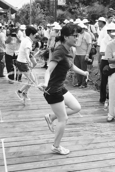 记者在现场看到,一根根杂乱无章的稻草经选手巧手揉搓,不一会就变成了一条规则、结实,长达2.8米的稻草绳。男选手将搓好的草绳交给同队女选手,她们就用它开始了跳绳比赛,用时最短即为优胜者。工作人员介绍说,不但要跳得快,搓绳也要牢固。一旦女选手把草绳弄断了,还得续接草绳。这个项目的年龄放宽到了58岁,因为传统的搓草绳很多年轻人都不会了。