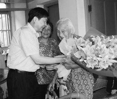 闵行区吴泾镇塘湾村3组的沈秋琴老人百岁了!镇、村干部上门道贺,镇党委书记张国荣还专门送上“万元敬老奖”和书有“福如东海、寿比南山”大蛋糕,老人乐得合不拢嘴(如图)。由于吴泾镇环境的逐年优化,老年农民每年体检、80岁以上老人增送牛奶、90岁以上老人增送代步车、百岁老人发放一次性万元敬老奖等措施的落实,吴泾老人的幸福感持续增强。