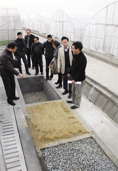 图为浦东蔬菜能级提升工作班子及部分实施单位负责人正在“元德”参观具有循环利用功能的菜田三级处理池,实地了解该项目的落实推进情况。
