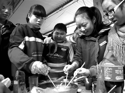 制作的菜肴品种多样,荤素搭配,全都为平时的家常菜,还有馄饨、水饺等点心。尽管有的小“厨师”刚开始生手,做出的菜咸淡不均甚至稍欠火侯,但他们在大家的“传经送宝”下渐入了佳境。图为学生们烧菜时情景。 通讯员 刘必华 摄/文