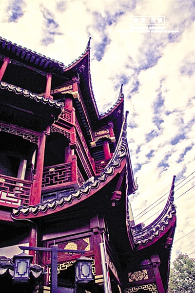 过石牌楼进入生产街,沿河一长排逶迤绵延的黑色廊棚,黑色小瓦盖顶,黑色小砖铺地,一盏盏大红的灯笼在廊檐下高高悬挂着,正所谓古巷通幽。明清时这条街上米行一家挨一家,那时家家门前建有风雨廊棚,到近代多已凋敝,如今的廊棚是重建的;平时年轻人都去上班,老阿婆们就在廊下以河岸做台,宰鱼淘米、洗菜浣衣;街上的老房子虽然门面不大,但小弄狭长,可见庭院深深;枫泾的河街都是一边人家枕河,一边人家面河;河对面是和平街枕河老屋,东头一座飞梁画栋、中国的戏剧始具雏形,到宋、金两代正式形成供戏剧所用的石基翘角的古戏台,这是古代专供演出的一种室外舞台。枫泾古戏台建在城隍庙广场上,一面临街,一面临河,每逢演戏,从水路乘船而来的人坐在船上就可看戏。