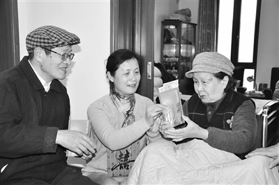 图为城市经典居委社区干事为高龄老年人送上印有“温暖送给您,健康长伴您”的红包,老人激动得连声称谢。 洪金龙 曲殿海 摄/文