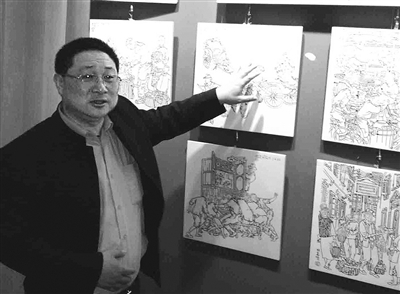 上海海派漆器艺术馆今年成功开发出老上海风情题材的漆器新产品,得到消费者的喜爱和选购。该馆把画家贺友直创作的老上海风情题材作品,还原移植开发运用到漆器艺术的画面上来,在漆器作品上逼真还原上个世纪申城市井故事和百姓风情。图为馆长王师军在向参观者介绍创造新漆器艺术品的情景。通讯员 吴毓 摄影报道