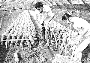 三是变温管理 在香菇转色期前,白天棚上要盖草帘,底下留通风口,晚上可揭开草帘和薄膜让空气充分进入。这样,白天和晚上的温差可达到10℃以上,连续3~4天的大温差刺激,菌棒表面就会出现不规则的白色裂纹,很快即进入转色期。