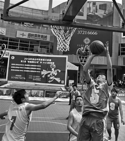 6月7日,作为 2014年金山市民体育大联赛的一项重要赛事,第三届“君逸国际公馆杯”男子三对三篮球比赛在百联广场举行,来自社区、机关、企业和部队等21支代表队参赛。同时篮球速成班、篮球趣味游戏和知识竞猜等互动活动,吸引社区篮球爱好者和居民积极参与。图为本届比赛揭幕赛正在进行中。通讯员 庄毅 摄/文