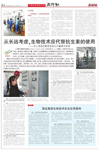 钟诚:我回国后创立了这个企业,我们公司的宗旨是“报国、利民、为集体”,我们希望公司朝着对社会、对行业发展有利的目标努力。近年来,我们在研发方面投入非常之大,现在我们已经动用了一些基因工程的新技术,在开发一些新的促进生长、减少疾病的生物产品。公司有个发酵基地在山东,有大约1000吨的发酵罐,在行业中可以说是非常领先的,这样也使我们有这个能力,为生物技术在农业中的进一步应用出一份力,促进整个行业的进步。记者 杨清悦