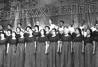 在共和国65岁生日到来之际,闵行区虹桥镇侨联日前在地铁10号线的乐虹坊商业广场,隆重举办“迎国庆、共欢乐”大型广场文艺演出。社区侨眷和文艺团队的100多名文艺骨干,选择自己精心准备的15个节目,为市民大众表演了器乐、歌舞、沪剧、独唱等丰富多彩的文艺节目,表达对祖国和上海的热爱、对虹桥镇建设发展的讴歌,赢得上千名市民驻足观看,为上海市民文化节增添一道广场文化的亮丽风景线。图为虹桥镇锦绣江南合唱队在表演《歌唱祖国》大合唱的情景。