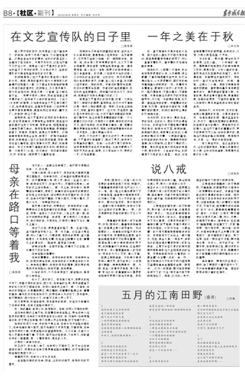 那种快乐还来自于被重视的感觉。在去各大队巡回演出时,常常是由公社党委的一名干部带队,还动用了当时公社唯一的一辆两吨卡车。每到一地,总会有人投来羡慕的目光,也少不了喝彩和掌声。演出结束,如果当地有食堂,就一律免费用餐,由公社统一结账,而更多的时候是回公社小食堂就餐。我记得,公社每月发给我们每人二十块钱的生活补贴,让我们统一购买饭菜票。那份感觉真的很爽,你看,在公社小食堂,我们跟公社干部吃一样的饭菜。干部们吃青菜烧豆腐,我们也吃青菜烧豆腐;干部们吃油豆腐塞肉,我们也吃油豆腐塞肉。进出墙门的机会多了,恍惚间,觉得自己好像也是墙门内的人了……