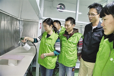 由国家化工生产力促进中心主办的“第三期中国水性木器涂料涂装国家职业技能培训班”于日前在金山区开班,来自全国各地的学员经考核合格,将获得国家职业技能中、高级工证书。图为学员在培训班所在的上海侨茂建筑防水材料有限公司进行实地操作练习。通讯员 庄毅 摄/文