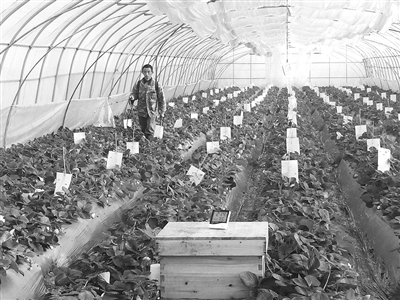 为了减少杀虫剂的使用,合作社根据昆虫趋光的特性,主要使用黏性黄板防虫。偶尔使用低毒杀虫剂,也会严格控制用量,保证草莓上市时安全无毒无害。“一般情况下很少用药,以早期预防为主。我们的草莓都是自己养的蜜蜂授粉的,如果有毒,蜜蜂最先遭殃。”