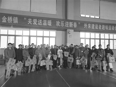 每年春节前,本应是大批外来建设者返乡探亲之时,但金桥镇镇域内部分企业由于春节期间生产任务繁重,大批外来建设者不得不放弃返乡与亲人团聚的机会,坚守一线工作岗位。为了让他们感受到政府及社会的关爱,深化和拓展关爱外来建设者主题服务活动,金桥镇总工会近日开展了“关爱送温暖·欢乐迎新春”外来建设者趣味运动会。来自镇域内10余家外来建设者较集中的企业共计100余名职工参加了活动。本次活动设置了飞镖、跳绳、投篮、套圈等趣味游戏项目,比赛现场欢笑声、加油声此起彼伏。