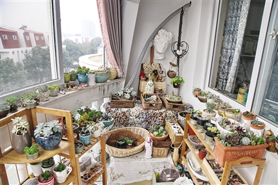 走进蔡女士家里,首先看到的就是她家一年四季花开不败的院子,即使是冬天,腊梅、茶花、瓜叶菊依然给院子增色不少。此外,还有石榴树、天竺葵、石蒜、常春藤、假山、各类盆景,自制的简易小温室里还有橡皮树等各类热带植物。蔡女士介绍,院子由她和父亲共同打理,一开始只是随便弄弄,结果种出兴趣来了,开始钻研各类植物的习性,数量也越来越多,现在大概共有300多盆、100多个品种。在二楼和三楼的阳台上,蔡女士根据自己的兴趣,种植了不少多肉植物,“一来多肉植物好养,二来观赏价值比较高。”阳台面积小,蔡女士自己设计出高低错落的布局方式,还自制各类复古风的容器,让小小的阳台化身为欧式花园。