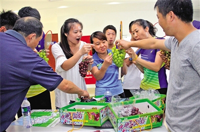 场馆外暑气逼人,场馆内比赛人气高涨。日前,在金山朱泾体育馆内,一场“施泉葡萄杯”业余羽毛球混合团体邀请赛吸引市民踊跃参与。其中,既有退役的专业运动员,也有来自浦东、闵行、杨浦、黄浦、金山以及浙江地区的业余爱好者,一些国家及市级专业运动员也应邀前来现场助兴。此次活动由施泉葡萄园独家赞助,凡参与活动者人人有奖,奖品为葡萄。此举旨在促进葡萄品牌与全民健身运动的互动发展,探索果品品牌的打造新路。图为参赛队员们在挥拍热身之余,免费品尝施泉葡萄,尽情分享快乐。