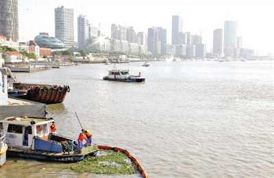 据悉,“十三五”规划中,黄浦江上游水域视屏监控系统的规划现已编制完成并送审,并计划在水生植物侵入上海的省界水域、区与区之间的交界水域以及各主要河道的汇集口水域架设视屏监控点,以及时掌握水面漂浮物动态。图为水上保洁人员正在清除被拦截在外白渡桥一侧的入江闸门外的水葫芦。