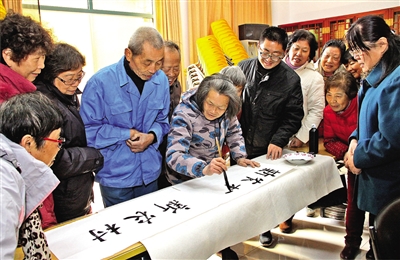 一个有着清华、北大访问学者背景的美术学博士,在宝山区大场镇葑村村一间由闲置房改建的书画室里,每周固定时间免费教村民书法、画画,为提升当地村民的生活品质提供了一个难得的平台。这位热心于公益的志愿者,就是日前受表彰的众多“宝山好人”中的一位代表——中国美术学院艺术学博士后流动站首位进站博士后、中国国家画院学术助理、上海大学美术学院硕士生导师苏金成。苏金成去年做过肝移植手术,但他表示会一如既往地将心中的善愿进行到底,让更多人受益。图为苏金成(右六)正在辅导村民习字。 相关报道:宝山区已形成志愿服务工作新常态