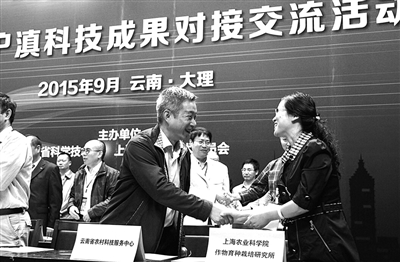 今年9月,上海市科委与云南省科技厅共同主办的“2015沪滇科技成果对接交流活动”在云南省大理州召开。上海农科院共有4个研究所10个项目在此次活动中签署合作协议。记者了解到,自2008年以来,“沪滇科技成果对接交流活动”已在昆明、保山、大理等州市成功举办了3届,取得了丰硕成果。多年来,双方共同支持了300多项保民生,促发展的科技合作项目。涉及农业、信息、材料、机械、生物医药、医疗卫生、交通安全等领域。