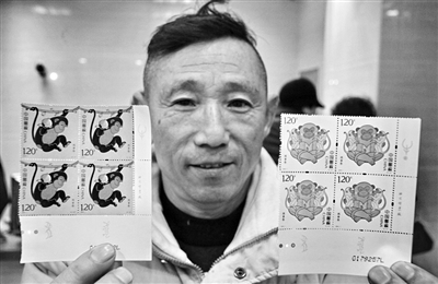 1月5日,中国邮政发行《丙申年》特种邮票,每套两枚,图案内容分别为:灵猴献瑞、福寿双至。全套邮票面值为2.40元。据了解,这套邮票是我国第四轮生肖邮票的开篇之作,也是首轮猴票的设计者黄永玉时隔36年再执笔。上海郊区相关邮局门市部一早就开门接待彻夜排队的集邮迷。图为在金山区石化邮政支局,集邮迷正在展示刚到手的猴票。通讯员 庄毅 摄/文