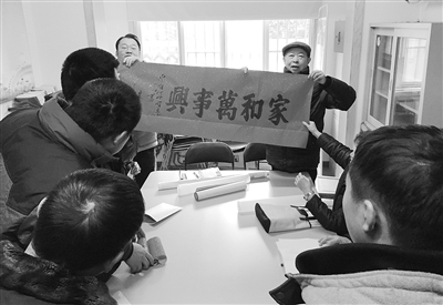 春节将临,古美三村党总支党小组长朱兴达老师受党总支委托,为6家经营户书写了不同内容的春联。如“传统美德立家规,社会新风传祖训,横批:礼仪千秋”,“诚信乃经商之本,道义是做人根基,横批:价值唯尚”,“十三五开局响亮,一六年撰写华章,横批:大展宏图”等。朱兴达老师为此特地跑了一趟福州路文化用品市场,买来了洒金大红纸。得知水果经营户小卓最近买了新房,正在装修,又用上好宣纸书写了“家和万事兴”横幅。小卓非常高兴,他说,他一定要把朱老师写的字画去裱好,再买一个漂亮的镜框,挂在客厅里,不忘记古美三村居民的情谊。通讯员 朱秀明 淞轩