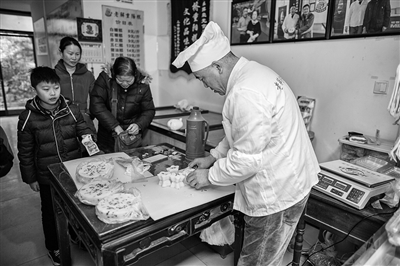 春节将近,腊肉、蒸糕、干果等各类年货成了热销商品。图为在嘉定区州桥老街上,一家专做各类蒸糕的铺子吸引了游客驻足观看。店家介绍,他制作的是徐行蒸糕,去年刚成功申请了嘉定区非物质文化遗产。记者 杨清悦 摄/文