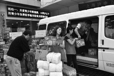本报讯6月27日下午,一辆白色依维柯满载着沪申五官科医院医护人员捐赠的万元救灾物资,当天傍晚抵达遭受龙卷风侵袭受灾严重的江苏阜宁县板湖镇,向灾区人民表达一份爱心。