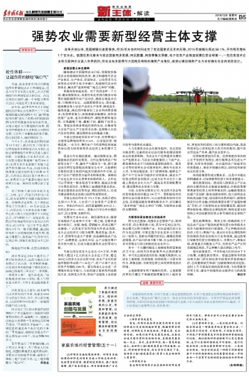 强化政策落实。中央和地方已经出台了不少政策,关键是抓好落实。要通过绩效考核推动相关部门研究制定落实政策的具体措施办法,总结提炼地方和部门创新政策的成功经验,适时上升为更高层面的政策举措,为培育新型经营主体、建设中国强势农业提供有力的政策保障。 张红宇