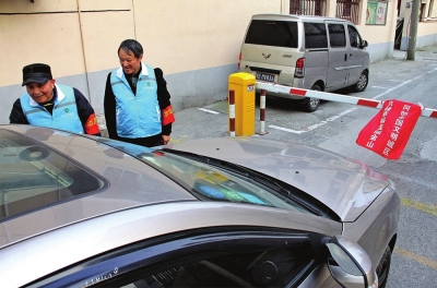 图为该小区志愿者正在对进出小区的外来车辆司机进行询问。