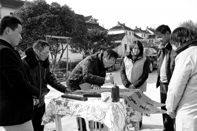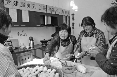 鸡年春节,廊下镇景阳村蒋菊英家里十分热闹。一大早,村民和志愿者齐聚她的家里。大家穿上围裙戴上袖套,分工明确:蒋菊英将糯米粉倒入红色的大盆里,一边加水一边和面,她的媳妇负责在灶头上烧水,其余的村民和志愿者忙着赶制汤圆,待会儿,这160多只新鲜出炉的汤圆,还要挨家挨户送给乡里乡亲品尝。69岁的蒋菊英祖孙三代同住一屋,去年,蒋菊英将“三上三下”的老宅装修一新,两个儿子还为她添置了许多绿色植物。“房子整洁舒适,大家来这里办活动,谈事情也方便。”蒋菊英家是景阳村3个宅基头中的一个,平时村民们相约“宅基头”,看书看报、喝茶聊天,每个月,村民代表还会定期开一次宅基会议,共商宅基上的大小事。廊下社区学校蒋连军老师在当地小有名气,原来在廊下小学做数学老师的他还有个特长是书法。每逢有节庆或是大小活动,蒋连军总会露一手,无偿献上自己的“墨宝”。每年过年,蒋连军都来到村里,为有需要的村民写上一副对联,送上自己的祝福。蒋连军告诉记者,近年来,廊下社区学校经常来到“宅基头”开展活动,有时候送戏下乡,有时候送一些健康养生知识,很受村民的欢迎。