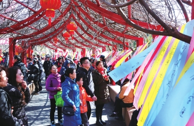 紫藤花架下,戏曲长廊,近千条谜语纸条在空中翩翩飘动,红红火火,吸引众多谜语爱好者切磋交流。大家拥挤在一起,兴高采烈地边赏灯、边猜谜,兑奖处排起了长龙,猜中谜底的男女老幼喜气洋洋,收获各种小奖品满载而归。寓文于谜,猜谜者畅游谜海,领略中华传统文化魅力、充分享受猜谜赏谜的乐趣。园内游客连赞浦兴的元宵年味最浓。
