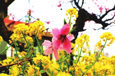 走在赏花步道上,成片的油菜花田也是一大特色,粉黄相间,颇夺人眼球!