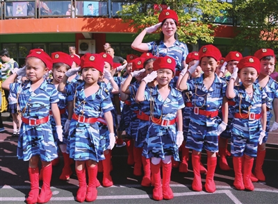 国庆前夕,浦兴社区世纪星证大幼儿园操场上,三百多名小朋友身着各民族绚丽服装,最惊艳的是大班小朋友身着解放军海陆空军服,和教师家长们欢聚一堂,共庆第十三届庆国庆“华服日”活动。在活动中,应邀前来的解放军某部9名战士,护卫着国旗举行了庄严的升国旗仪式,对小朋友进行爱国家、爱人民教育。