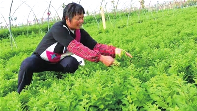 蒋月忠乍一听好像是个男人的名字,而出现在眼前的却是一位六十有五的乡村妇女,她身体壮实,性格随和,与其交谈时总是一副灿烂笑脸。说明来意,蒋月忠便把我们领进了她的枸杞藤的种植地。她介绍说:“这些环棚上的尼龙早已被卸下,但天一冷就要及时披上去,以防霜冻,现在正是采摘枸杞头的上好时间,老了就不好了。”一眼望去,这枸杞头只长有二寸之高,疏疏密密,生清碧绿。“难道不收它的果实?”记者问,“是的,伲这里的农家人从不收它的果子,而是采它的‘头’”,蒋月忠爽快地回答。“那市场上好销吗?”“很好销,市民十分爱吃枸杞的嫩头,虽有些苦味,但有清凉解毒的功效。”在一问一答之间,蒋月忠还蹲着身子,操着一把小小的锋利割刀,极为熟练地割下了一把又一把。这割下来枸杞藤头,约一根手指长,蒋月忠说,“这才是最好的一段,制冷菜、炒热菜等都能烹制出上好的美味,且肥嫩爽口还有药用功效,脸上发点小毒气,吃了它,定会好许多。”蒋月忠是一位名副其实的种田老把式,初中毕业后,19岁就开始种田,1988年就到附近部队农场包种了300多亩土地,搞起了规模种植产业,种植水稻、棉花、黄豆、玉米等,早已积累了丰富的种田经验。2014年建立家庭农场开始种枸杞藤,年年都有很好的收益,就这一项上,每年能获取25万余元的净利润。蒋月忠说:“种枸杞藤主要靠肥水来把控获取好的收益。”为此,她舍得投入,花5000余元资金在每个棚内安装了“滴水管”等现代化灌溉设施,保证土壤湿度,使枸杞藤生长有足够的水分。同时又要施有机肥,于是,她每年就要购进约30多吨复合肥施于田间,促使枸杞藤长得叶片肥厚、鲜嫩、光亮,有好的口感。当被问及销路上有否困难时,她笑着说:一切都十分顺利,小贩上门收购只要手机一打就驱车来了,她还有女儿做帮手,在网上销售也做得十分顺利,销售的价格也十分合理,每公斤收购价14元,上市场零售价要达到每公斤30元。但蒋月忠还是以收购价为主,因为她还有许多的菜田要照顾。