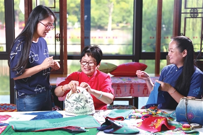 ■一个有阳光的午后,宝山罗泾十字挑花传承人陈育娥、郑晓蓉、杨海燕师徒三人聚在一起为3月29日的民博展做展品准备工作,看到工作室里的土布,大家又不约而同地拿起针线挑起花来。(供图:朱晔)