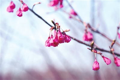 崇明山樱花园负责人刘公梅告诉记者,山樱花也称绯寒樱、钟花樱桃,在我国主要分布于台湾﹑福建﹑江西﹑湖南﹑贵州等地,喜欢栖息在海拔500米至1500米处。而在崇明栽种的这些山樱花,源自合称樱花四大观赏种的“福建山樱花”、“垂枝早樱”、“高盆樱”和“东京樱花”,经过8年的人工驯化,已经适应了崇明的土壤气候,成为具有本土特色的品种。不过,它们在形态上还是保留了野生山樱的特色﹕花枝纤细,单瓣的花朵颜色艳丽,三至五朵共生。由于山樱盛放时几乎不长叶子,繁花锦簇挤满枝头,远远望去,好似一串串姹紫嫣红的铃铛,摇响了生态岛早春的乐章。