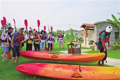美丽乡村的打造,不仅仅是乡村外部环境的治理,农民居住条件的改善……更需要打造农村自身的特色产业。奉贤柘林镇迎龙村,根据自身条件打造了一片休闲活动基地,通过提供团建活动设施等活动基地建设吸引更多市民光顾迎龙村、了解迎龙村。图为基地教练正在为团建队员开展皮划艇操作培训。 记者 夏常青 摄影报道