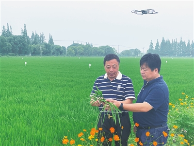 图为庄行镇农业中心主任张峰(右)与合作社负责人陈嵚崎在田头观察生态水稻生长情况。(摄/胡纯洁)
