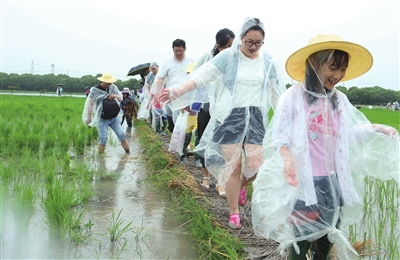 “我们小时候老师会教 ‘一粥一饭,当思来之不易’,现在孩子生活好了,很难理解‘来之不易’,这次插秧能够让他好好体验一下收获的不易。”6月19日早晨虽大雨滂沱,仍有不少家庭早早地来到了市农科院位于奉贤庄行的综合试验站,体验下田插秧的辛勤与乐趣。