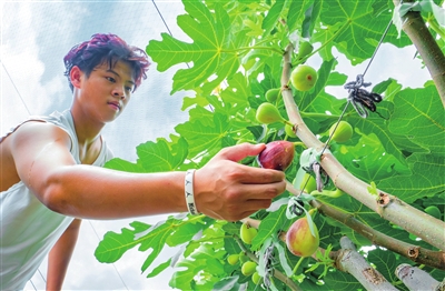 走进位于嘉定区世盛南路的菊园百果园,无花果种植区内散发着甜甜的果香,青绿色的枝叶下挂着几抹诱人的紫红色。从枝条上摘下一颗新鲜的无花果,轻轻一掰,红色的果皮露出乳白色的薄层,软嫩多汁,绵密香甜。
