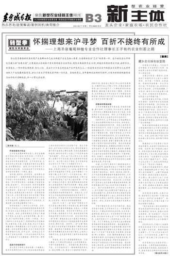 千淘万漉虽辛苦,吹尽狂沙始到金。通过多年奋力拼搏,王子有如今已从一个普通农民变身为一个事业有成的农业创客,从无到有、由弱到强,使自己从一次次的摔打中不断走向成熟,先后被评为金山区“十佳”新型职业农民、上海市农民工个人先进和金山工匠,并入了党。为了不辱使命,王子有现又在为擘画新蓝图继续抒发他的理想情怀。通过腾笼换鸟,对四个葡萄基地进行产业结构调整,将其中两个葡萄基地改建为蟠桃与花卉基地,旨在助力金山“三个百里”(百里花园、百里果园、百里菜园)核心区建设。目前,蟠桃改建基地已完成前期苗木栽种,花卉基地也开始着手在建,并力争将其打造成集育苗、种植及包装配送于一体的全产业链的金山花卉种植基地。通过新征路上再出发,让当年驾拖拉机来沪追梦的那段令人回味的“浪漫”激情经历赋予更多新内涵。
