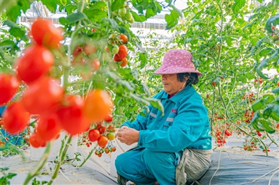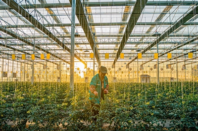 先进的种植技术令人啧啧称奇。仅仅是番茄一种作物,就种出了3种花样。温室顶部与地面之间拉起根根吊线,整齐排列,番茄、黄瓜、茄子的藤蔓攀缘而上,这是吊蔓式栽培。以沙子和煤渣为基质生长的小番茄正值授粉期,工人正在点花授粉,这种沙土栽培模式可以适应更多类型的土地环境,且产量极高。多品种融合的树形种植被用在辣椒、番茄和茄子上,待作物在顶部圆盘上挂果后便自然成荫。