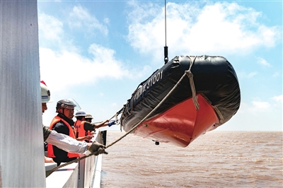 ⑤在观测到水面异常情况后,一艘快艇正在吊下,它将载着数名执法人员迅速抵达目标区域。