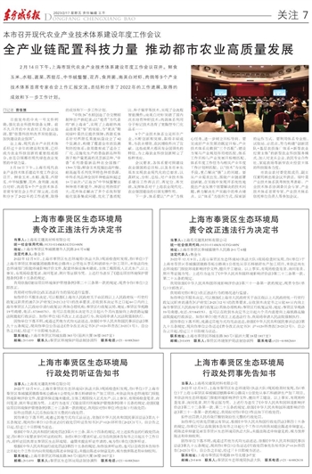 上海市奉贤区生态环境局责令改正违法行为决定书