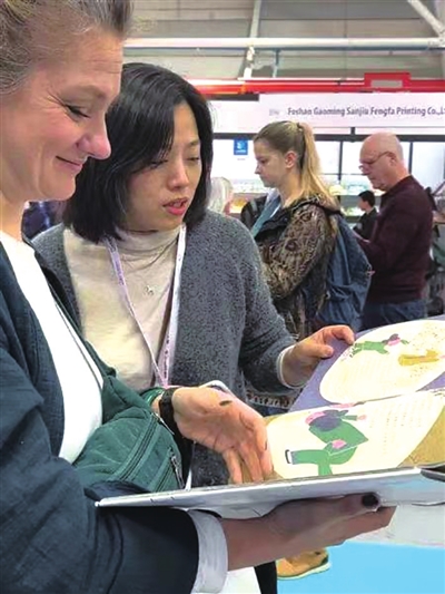 “我很喜欢这本书。在欧洲,人们如果读到这样的故事会感到很亲切、有吸引力,这样的图画书能让越来越多的人参与到刺绣或编织中来。”在博洛尼亚国际童书展中国原创绘本展位上,一位来自瑞典斯德哥尔摩知名少儿出版机构的工作人员一边兴致勃勃地翻阅着展架上的非遗技艺传承绘本《金绣娘》,一边对身边的资深版权代理谢小姐讲述她的感受。她看得仔细,逐页翻看、时不时提问,她对随书同行的、以罗泾十字挑花技艺挑制的书签也很感兴趣,拿在手上细细品赏。另一位资深中法版权代理认真地阅读完《金绣娘》后,拿起一块深蓝色土布挑黑线滚暗红边、被誉为“中国式简爱帽”的罗泾十字挑花兜头巾,啧啧称赞“没有什么比打开一本内容丰富的图画书、触摸一件精美的挑花作品更能打动人心的了。”